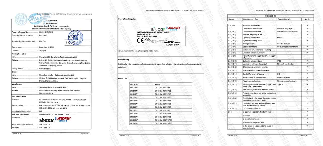 Marchés internationaux : Des régions comme l'UE (certification CE), le Moyen-Orient (certification SASO) et l'Asie du Sud-Est (certification TISI) exigent toutes que les lampadaires solaires soient conformes à la norme CEI. Par exemple, l'entrée dans l'UE exige la certification CE-EMC + LVD.