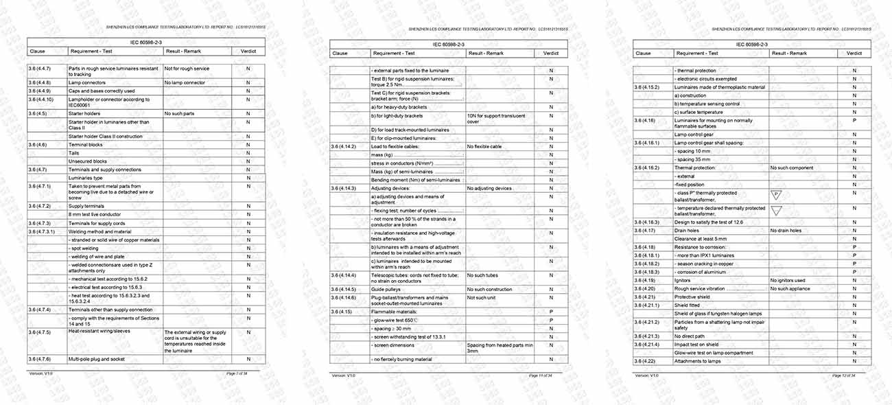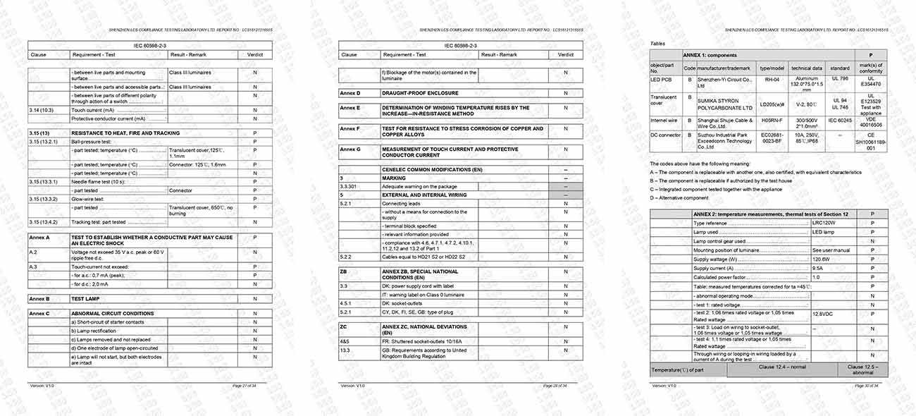 Essais d'étanchéité : Le luminaire a été soumis à des cycles de températures élevées et basses (-25 °C à +55 °C, 20 cycles) conformément à la norme CEI 61347-1. Après les essais, le luminaire a pu éclairer normalement sans aucune pièce détachée.