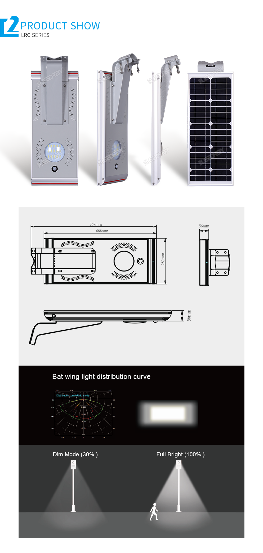 Dimensions du produit (mm) 765*280*56 Poids net (kg) 10,5 Dimensions du carton (mm) 840*350*260 Poids brut (kg) 12 Paramètres de lumière Puissance lumineuse (W) 15 W Flux lumineux typique (Lm) 1800 Température de couleur (K) 2700-6500 Angle du faisceau (°) 120° Durée minimale du travail (heures) Pleine luminosité 13 Mode tamisé 39 Paramètres d'environnement Température de charge (°C) 0 °C à +60 °C Température de décharge (°C) -20 °C à +60 °C Température de stockage (°C) -20 °C à +45 °C Installation Diamètre recommandé du poteau supérieur (mm) 60~105 Hauteur d'installation recommandée (m) 4 ~ 6 Distance d'installation recommandée (m) 10 ~ 15