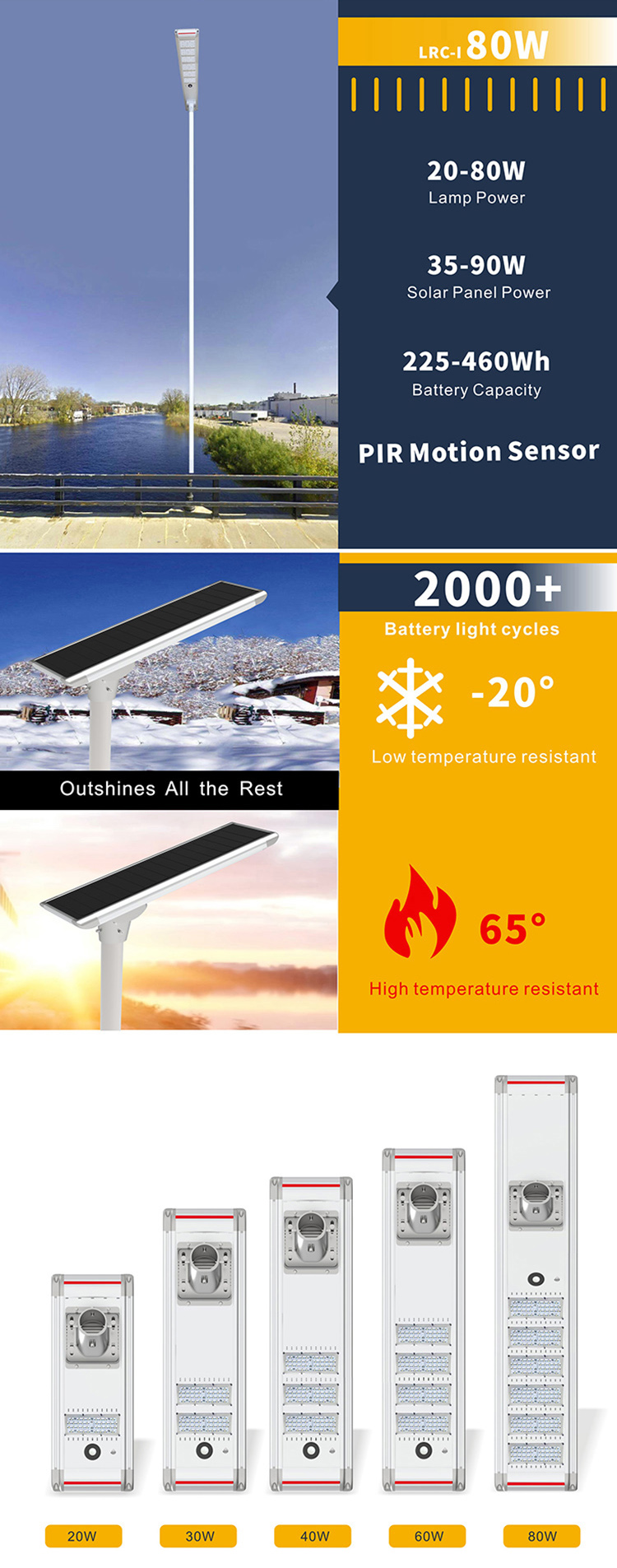 LRC-I80WLampadaire solaire 80 W LED aluminium aviation intégré tout-en-un lampadaire LED solaire étanche extérieur Lampadaire solaire à LED avec batterie au lithium intégrée à énergie verte en gros 80W nouveau design lampadaire solaire à batterie au lithium.