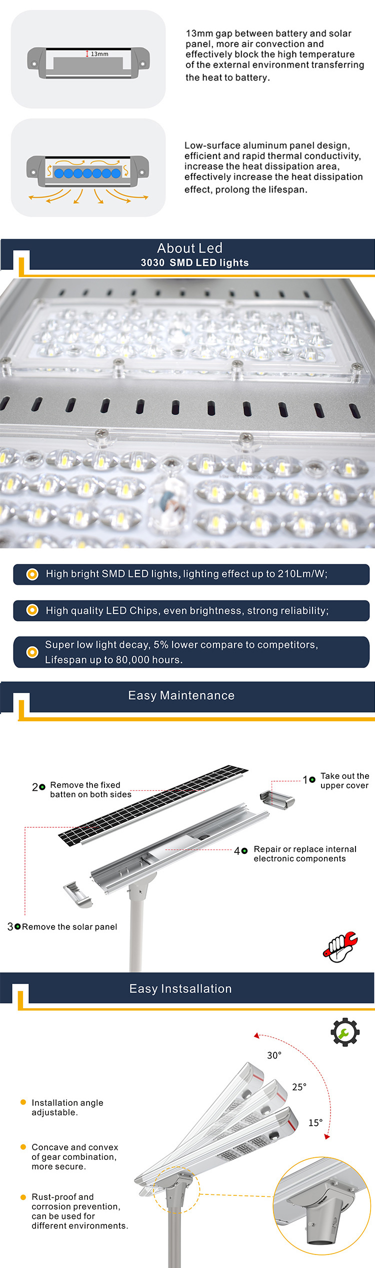 A2: Oui, tous les lampadaires solaires à LED de toutes puissances peuvent être fabriqués sans capteur, nous définirons un contrôle de minuterie pour les lampes.